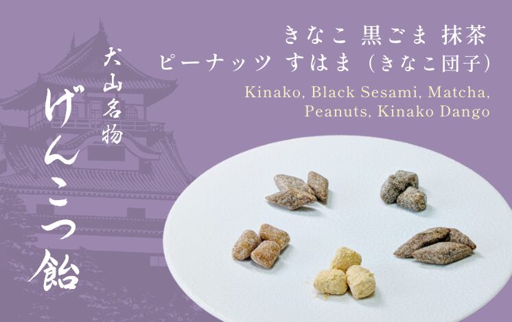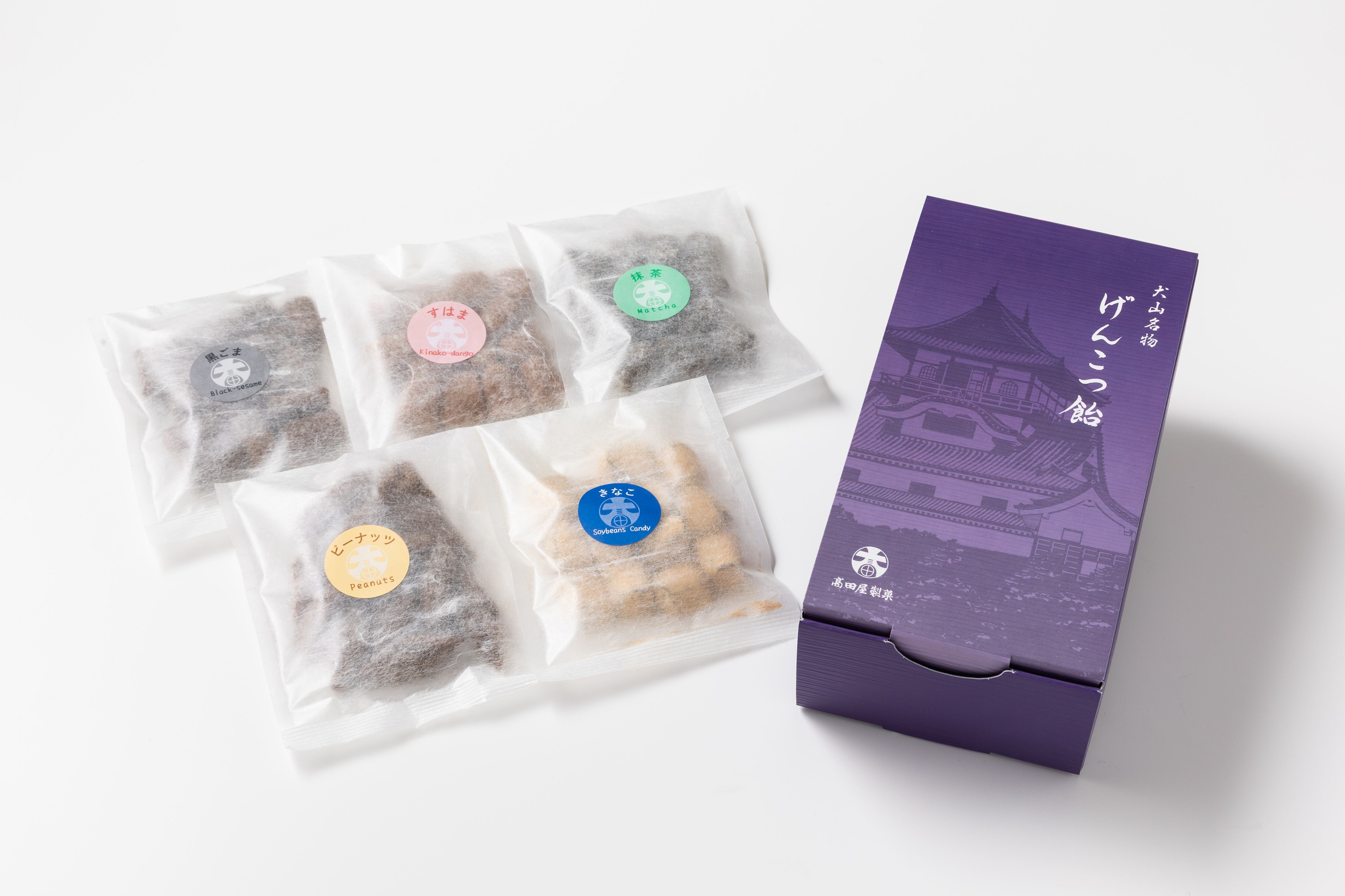 五つの味わいを詰め合わせた、犬山名物げんこつ飴の彩り豊かな一箱。
